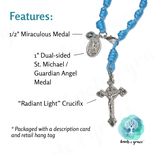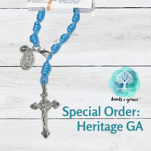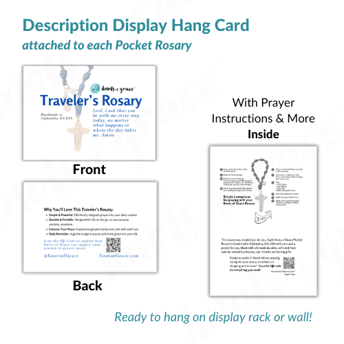 This handcrafted traveler's pocket rosary was custom-designed for Heritage in Crawfordville, Georgia. Featuring a silver Radiant Light Crucifix, it serves as a sign of hope and strength for daily prayer. Compact and travel-ready, it’s made with quality materials and care. All rosaries include a descriptive card and hang tag for easy retail display.