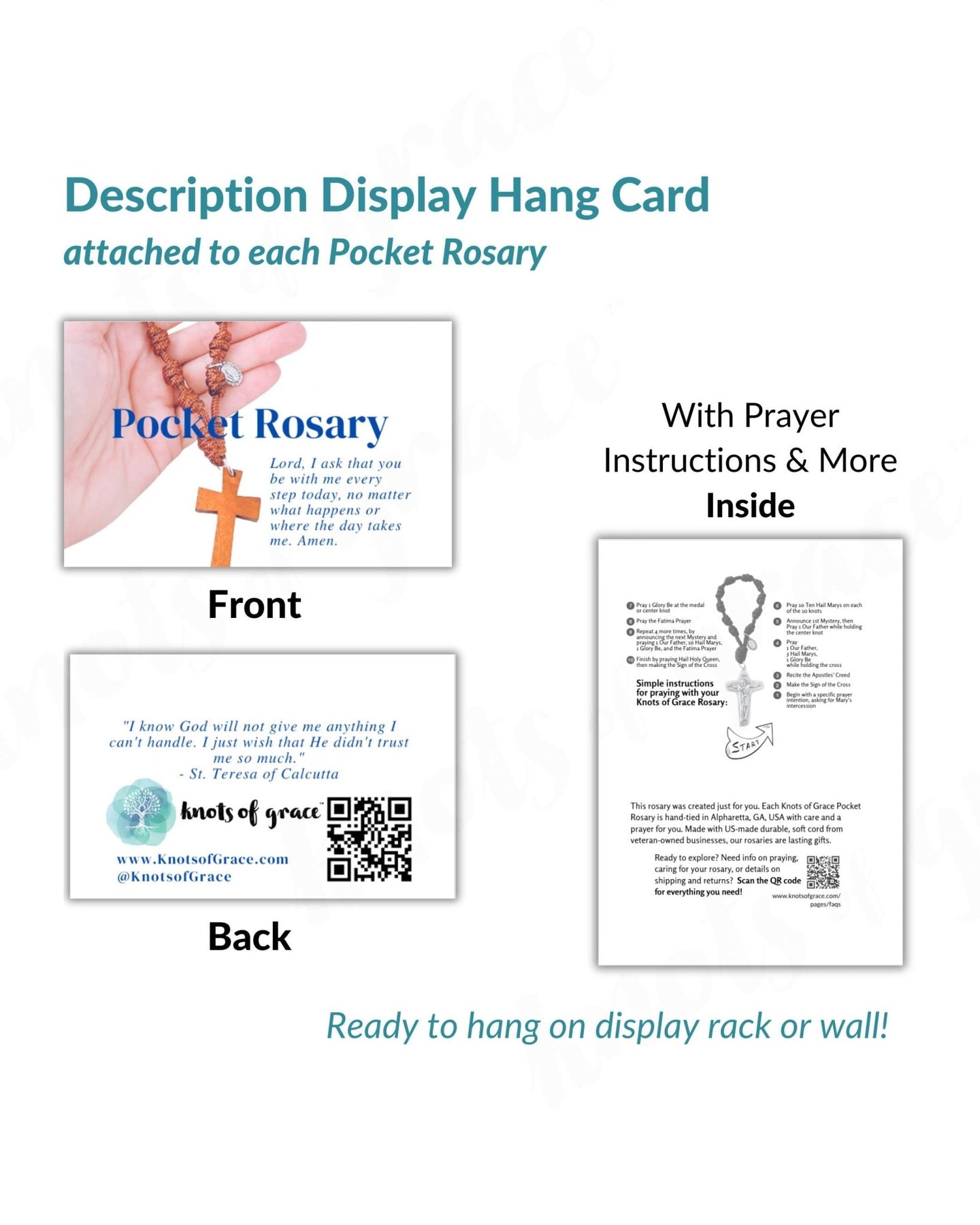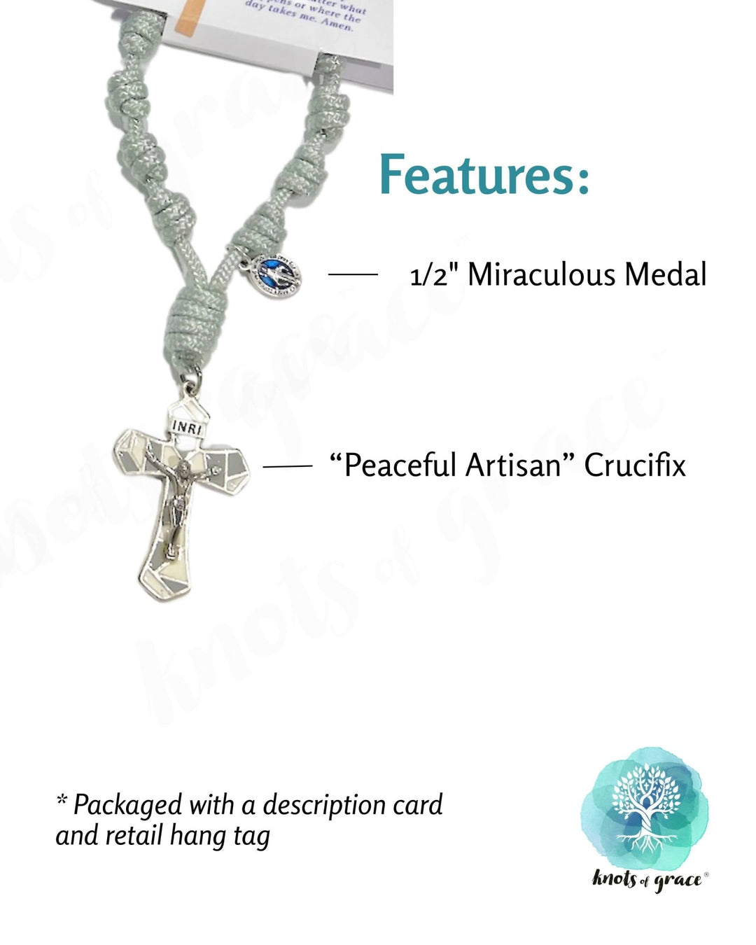 This one-decade pocket rosary was made specifically for Heritage in Crawfordville, Georgia. Featuring a white and gray stained-glass-style crucifix, it offers a serene presence during prayer and reflection. A gentle and beautiful spiritual gift. All rosaries include a descriptive card and hang tag for easy retail display.